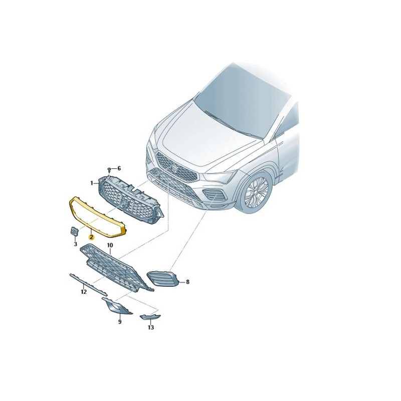 Marco decorativo para la rejilla delantera con acabado cromado brillante, ideal para realzar la estética frontal del vehículo aportando un toque elegante y distintivo. Diseño específico para un ajuste perfecto y mantenimiento del estilo original SEAT.